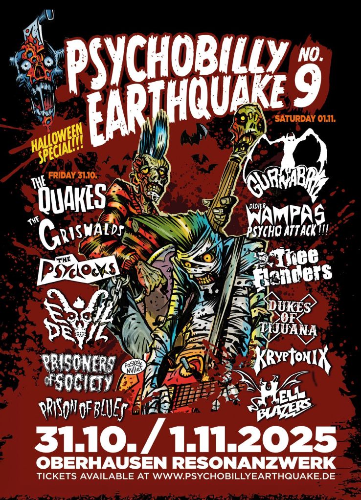 Friday October 31st and Saturday Nov 1st Psychobilly Earthquake in Bremen featuring the Quakes, the Griswalds, Psyclocks, Evil Devil, Prisoners of Society, Prison of Blues, the Guanabatz, Didier Wampas Psycho Attack, Thee Flanders, Dukes of Tijuana, Kryptonix, and the Hellblazers.