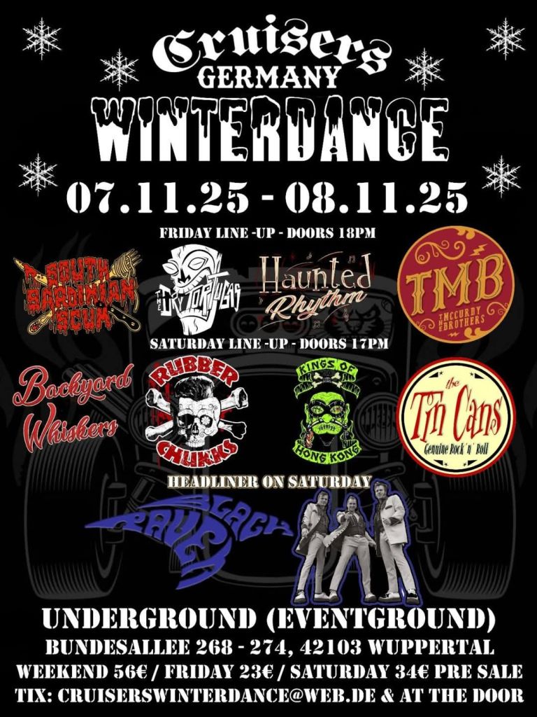 Friday 7th Nov- Saturday 8th November The Cruisers Winterdance at the Underground (Eventground) in Wuppertal, Germany featuring the Kings of Hong Kong, the McCurdy Brothers, Rubber Chukks, Tin Cans, Backyard Whiskers, the Dry Tortugas, Haunted Rhythm and Black Raven.