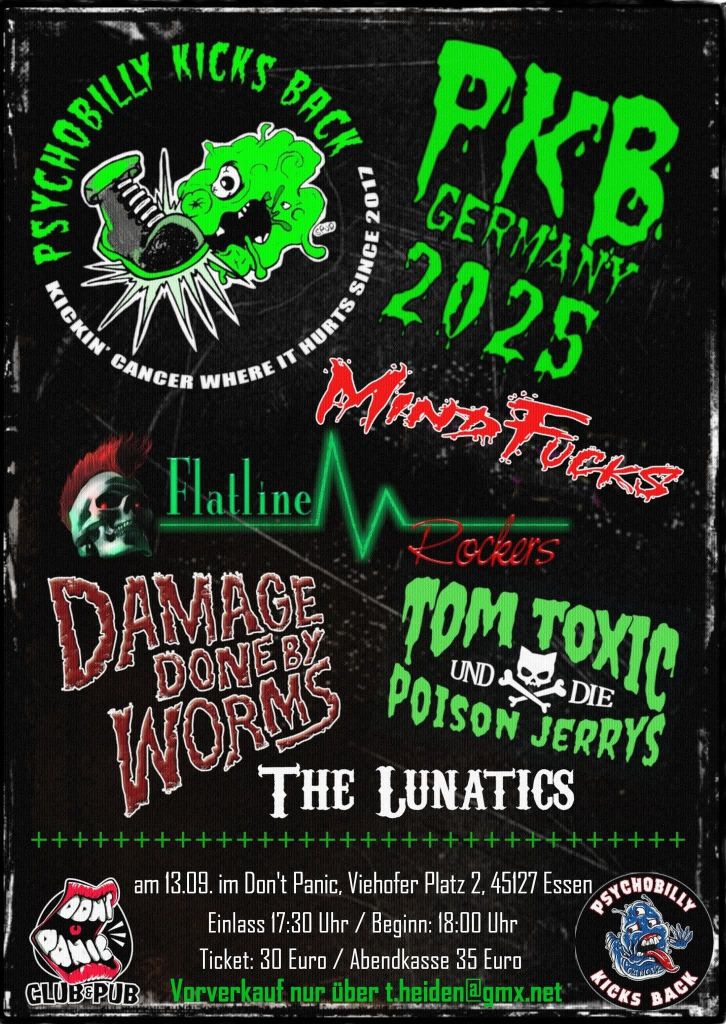 Saturday 13th September, Psychobilly Kicks Back in Essen, Germany, featuring the Mind Fucks, Flatline Rockers, Damage Done by Worms, the Lunatics, Tom Toxic & die Poison Jerrys
