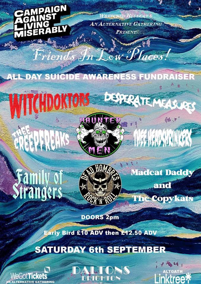 Available on the same day is an all-day festival to raise awareness of suicide prevention featuring the Dead Hombres, the Haunted Men, the Witchdoktors, the Desperate Meaures, and the Creepfreaks, this takes place at Daltons in Brighton.