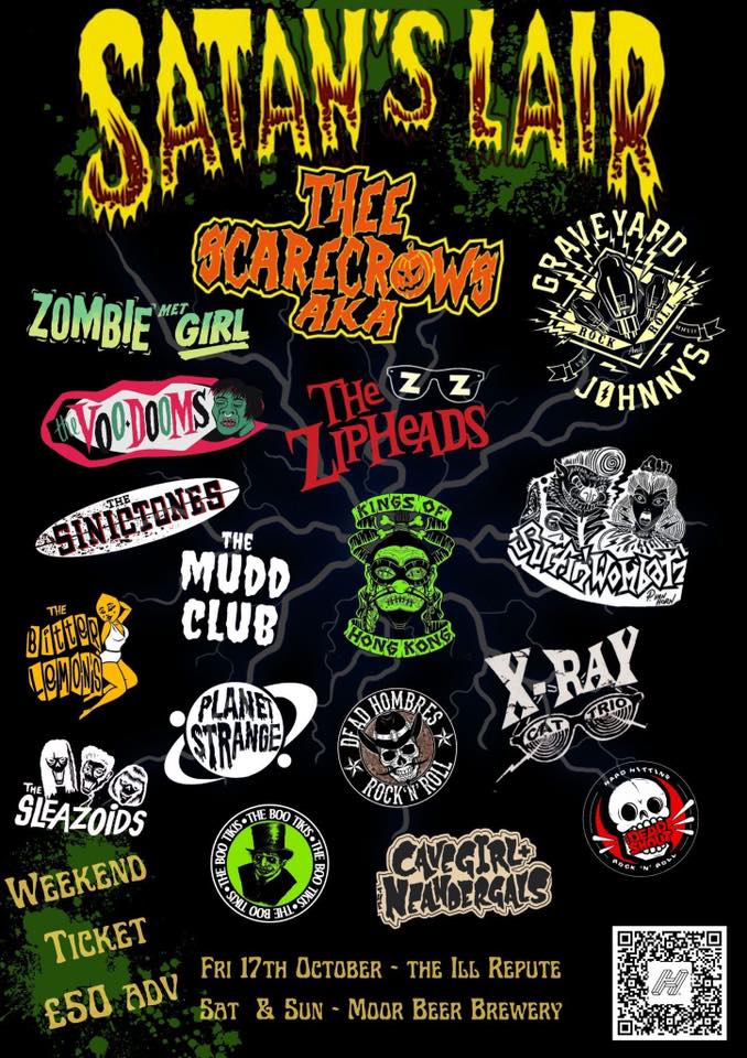 Satan’s Lair Festival featuring 17 bands at the Ill Repute on Friday 17th October and at the Lost Horizon on Saturday 18th and Sunday 19th. Featuring: the Zipheads, the Graveyard Johnys, the Voodooms, Planet Strange, the Dead Shout, the Sleazeoids, Cavegirl and the Neandergals, the Dead Hombres, the Mudd Club and the Surfin Wombatz, amongst others.