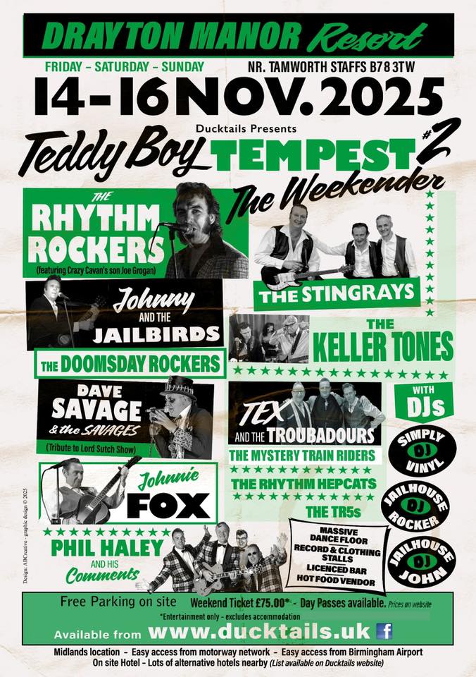 14th-16th November there is a Teddy Boy Weekend at Drayton Manner in Tamworth, headlined by the Rhythm Rockers, the Stingrays, Johnn and the Jailbirds, Dave Savage and the Savages, Tex and the Troubadours, Johnnie Fox, and Phil Haley and his Comments, the Doomsday Rockers and the Keller Tones, amongst others.