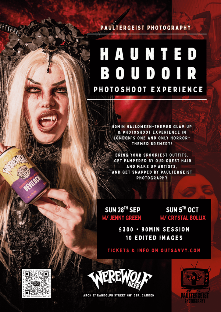 If ‘cute poses’ aren’t your thing, Di Silvestro has also got you covered. “Haunted Boudoir is on the 20th of September and the 5th of October. Basically I did Halloween promos at Werewolf Beer [in Camden] on the 3rd of August and built two sets. It sold out within an hour of me announcing it, so I added another day on the 10th of August with the same set. I had a lot of people message, [saying] ‘I’m not a performer, can I join?’ I thought, ‘hang on a minute. We could do that again’. Werewolf beer is really good at Halloween events, and the Haunted Boudoir’s going to be the same set. It’s going to be a spooky photo shoot experience.I’ll have a hair and makeup artist on the day. I will guide them. Jenny or Crystal will do their makeup and hair. Werewolf beer is such a cool venue: it’s got a vintage ghost train and it’s got so many different props. The good thing with starting with live music is I can shoot pretty much anything, and everything is easy, because I learned with the hardest lighting there is. If I can make Iggy Pop look good, I can make anyone look good!”
