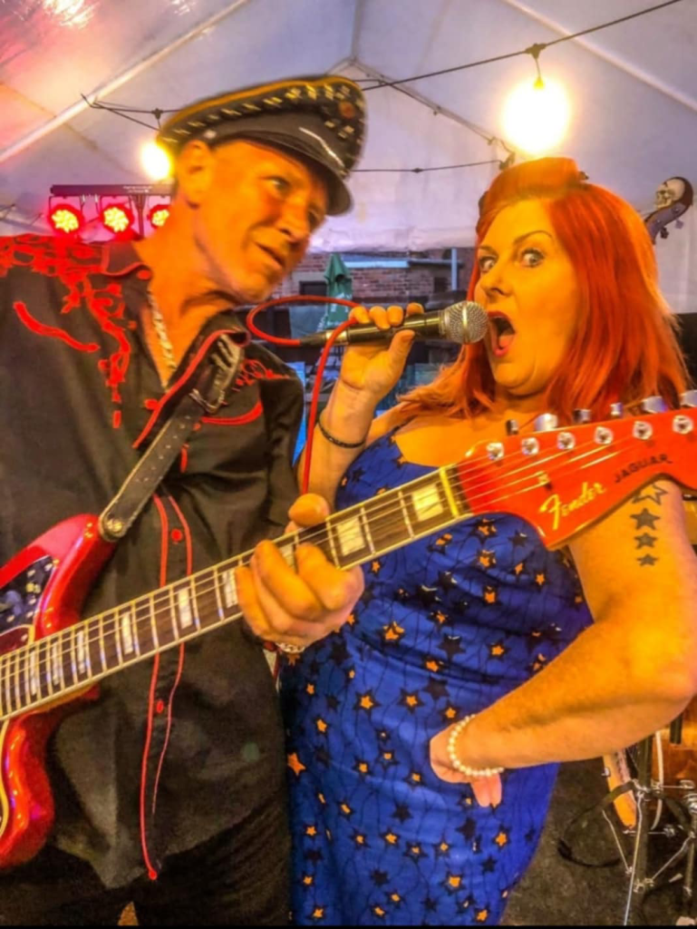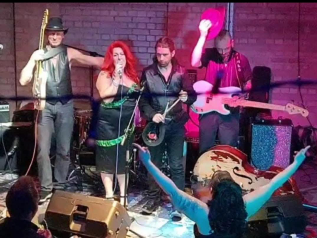 We’re more trashy rock and roll [than rockabilly], we’re more fun. Okay, we’re a cover band but we do a few obscure tunes that people think [we’ve made] our own. We do like T-Rex and we do Billy Idol and Blondie and a bit of Wanda Jackson. We don’t take it too seriously we don’t rehearse a lot, [but] we don’t need to cause we’re always gigging. When some bands are together, they’re made for rehearsal or they’re made for a gig. We’re like a little family. We’re a bit diverse. We don’t do too many posh things. We’ll go posh if we want to, but we’re a bit rough around the edges.