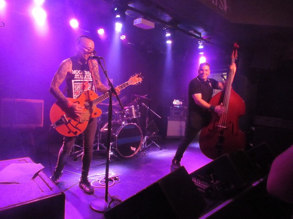 To the Moonshine Stalkers, whom I last saw in Camden last year, which is relatively recently these days. Quite unlike when the band started all those years ago when you could see them play most weeks in London. The trouble is, is that Bruno and drummer Txerno both play in the Brains and Andy Kandil plays with French gore psychobillies Banane Metalik, as well as Space Bop with Phil Polecat, and a new band with Djamel Abina from the Blue Carpet Band. Suffice to say that these boys are busy. Nevertheless, the word on the street is that a new album from the band is not too far away. In any event we should be grateful that the band is playing. Three more talented individuals it would be hard to conceive of and rest assured that the band always delivers a performance right from the top drawer. And tonight is no exception. Beginning with a thank you to the Deltas without whom Andy says that this band probably would have been a metal band. To which Bruno rather wittily added ‘you are in a metal band’ a remark directed to Andy’s membership of Banane Metalik. But it’s then headlong into a set of some of the finest psychobilly songs ever written, all of which are delivered at breakneck speed and with musicianship that is simply off the scale. ‘Slingshot’ being a case in point. Andy then retold a story about being stranded with the Deltas in Belgium some ten years ago and Bongo saying that he would show the band a good time. He suggested leaving the bar and going to the Pharmacy whereupon he bought some Listerine and proceeded to get pissed on it.