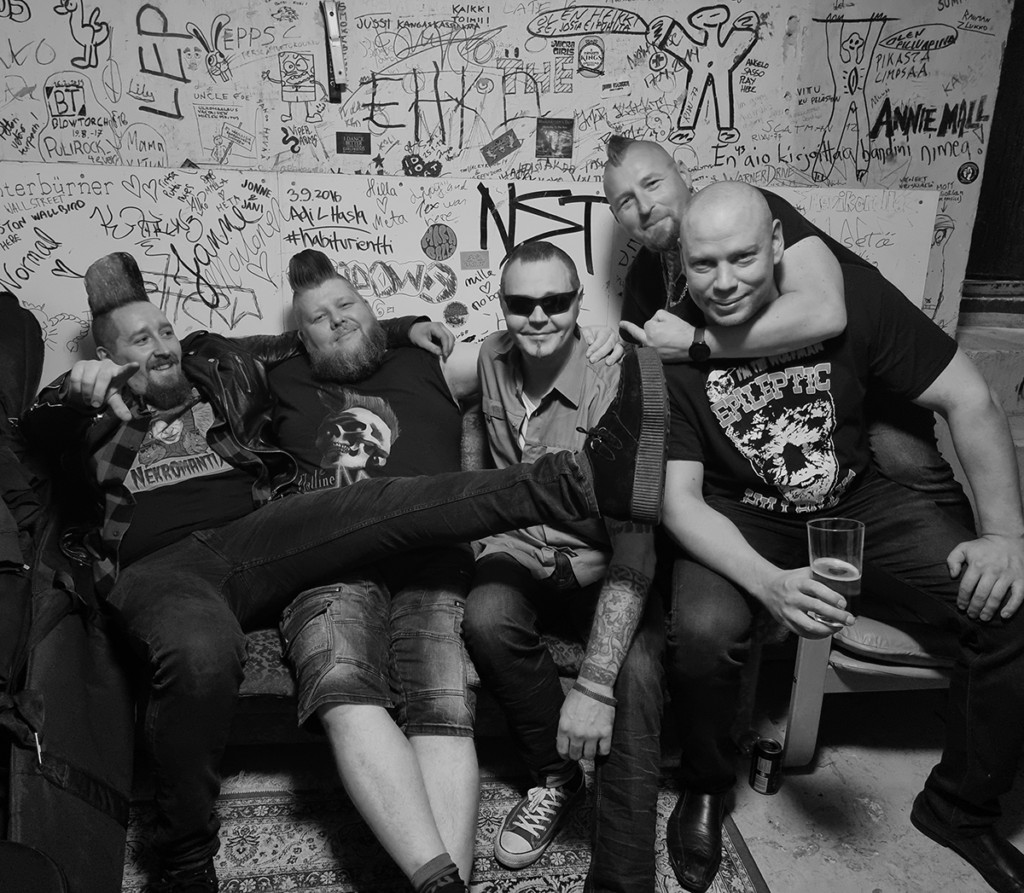 “I have a fun story,” Jere Lähteenmäki interjects. “When the first Flatline album was released, I was a very young boy. I was a big metal music fan, and also I liked the Nekromantix and Mad Sin. I was something like fifteen. One day, A-V asked me, ‘hey, do you have some whiskey?’” Of course I have whiskey. I’ve played in other like Billy Bands before I joined the Flatline Rockers. And of course I have whiskey. ‘Hey, you have to come here, come sing with us’ [he said]. And after that they were, ‘hey, you are in the band now. Play the guitar and sing those songs. Yeah.’” He laughs hysterically at how he was press-ganged into the band. Nauha clarifies. “Okay. So it was quite funny because we were recording the album, some of the first takes of the album. It was in Tampere, where Jere lives. All of us are from Pori on the very, very west coast of Finland and Tampere is about 100 kilometers inland, so to speak. We were just starting the recordings there. And these guys drink beer. Yeah, I don’t drink beer. I can’t drink beer. So we sort of ran out of alcohol, and we were like, so who do we know in Tampere? This guy shows up in the middle of the night, first of all, with a guitar and a bottle of whiskey, and he knows like two, three of our songs…and he sort of joined the band.”