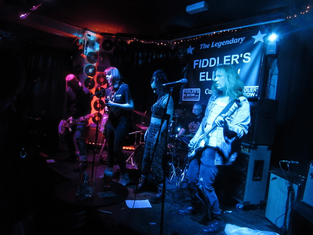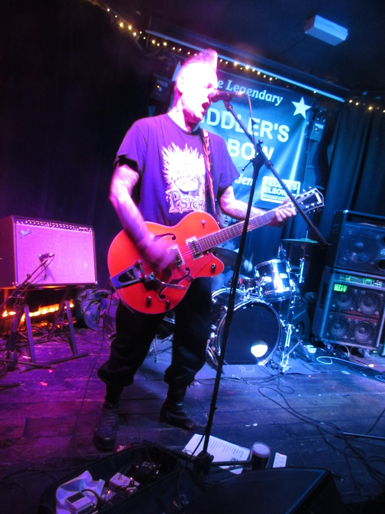 Next up were Dead Shout, about whom, I have had positive things to say in the past. Well, amplify that by a factor of about ten, because this trio absolutely blew the roof of the Fiddler’s elbow. In Jack Elfick the band has, not only, a fine frontman, but a brilliant musician too. He dispenses excoriating guitar riffs at will. He is ably supported by slapper extraordinaire Darren ‘Eddie’ Edwards and superb drummer Gary Voodoo. The band is incredibly tight and whether performing original material such as ‘Jump Your Bones’ or covers such as the Beatles’ ‘I Me Mine’ really rock up a storm. They are the best new band to emerge in quite some time and I look forward to charting their progress, which, I am sure, will be extremely positive.