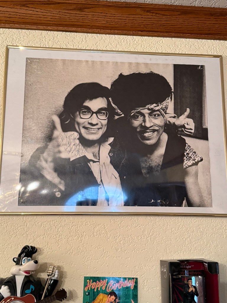 As wild as he is on stage, he’s just as low key and timid off stage. It’s a contrast. So I go up there and sit down and sandwiches, Coca Cola, whatnot. We start talking, and we talk again about Wanda Jackson and Carl Perkins and Sam Cooke, always Sam Cooke and Fats Domino and Little Richard. Sam Cooke and Little Richard, I think, were his two best friends. We’re talking and he’s starting already to talk how difficult it is for him to find Rock and Roll musicians, players that he can play with. He tried to get in touch with some of the Bluecaps, but it fell through whatever.