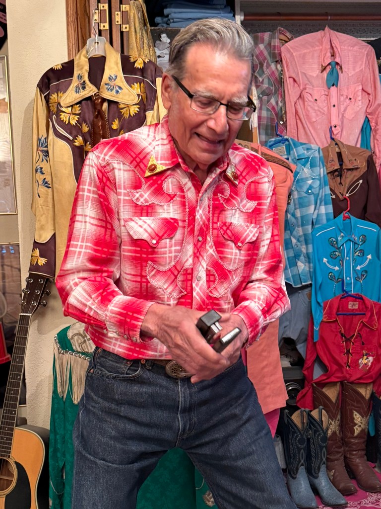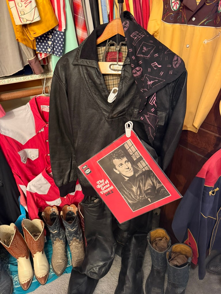 In one corner, almost hidden next to the wall of vintage westernwear, is a small leather jacket and trousers. It’s part of Gene Vincent’s stage wardrobe and is likely priceless to memorabilia collectors. But how did Weiser get the suit?