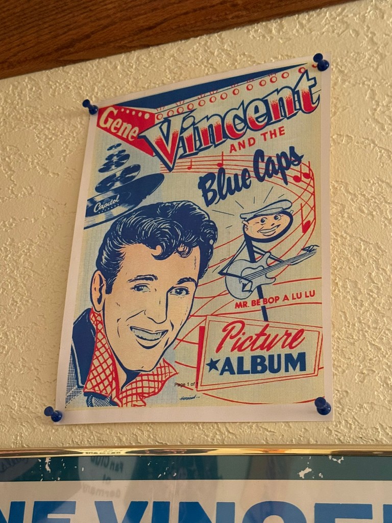 Gene was living in an apartment on Fuller or Fulton. I was with my parents, my brother was living on Hayworth Avenue in Hollywood, so maybe like three or four blocks apart. So now I had gotten already Gene’s phone address, I guess from the operator. I go in my car and drive towards his apartment, like I said, a few blocks away, and I see this convertible coming at the same time that I’m going there. I can tell right away it’s Gene Vincent. So he parks, I park, and I go towards the apartment. ‘Gene, I’m the founder of the Gene Vincent Little Richard fan club. Can I ask you a few questions?’ He says, ‘yeah, come on in, come on in.’ He started giving me soda pop and sandwiches and all kinds of stuff. It’s very, very friendly. You know, very low key, but very friendly.